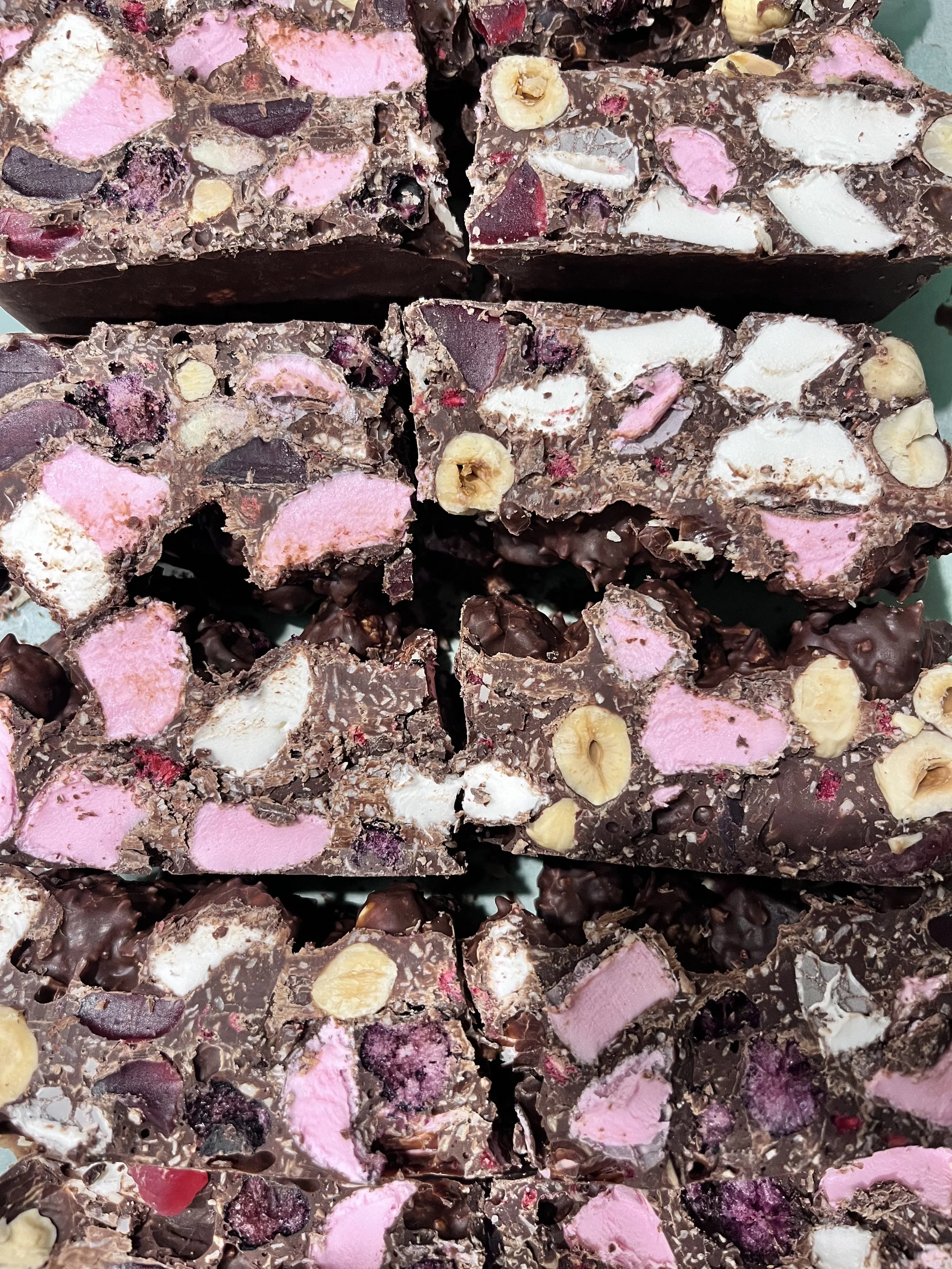 Our decadent Rocky Road made with Callebaut couverture chocolate, Three Peaks Organics freeze dried blueberries, Forager Foods freeze dried raspberry crumbs, Hazelbrae Roasted Hazelnuts, roasted shredded coconut, raspberry jellies and salted pretzels